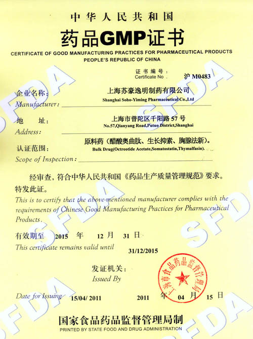 近日,公司(si)胸腺法(fa)新(xin)通過了國家食品(pin)藥(yao)品(pin)監督管理局(ju)GMP認(ren)證,目(mu)前公司(si)共有(you)胸腺五肽(tai)、生長抑素(su)(su)、醋酸奧曲肽(tai)、鮭降鈣素(su)(su)、胸腺法(fa)新(xin)5個品(pin)種獲得(de)(de)國家藥(yao)監局(ju)頒發的(de)GMP證書(shu),目(mu)前,蘇豪逸明制藥(yao)是國內獲得(de)(de)GMP證書(shu)最多的(de)多肽(tai)原料藥(yao)生產商。