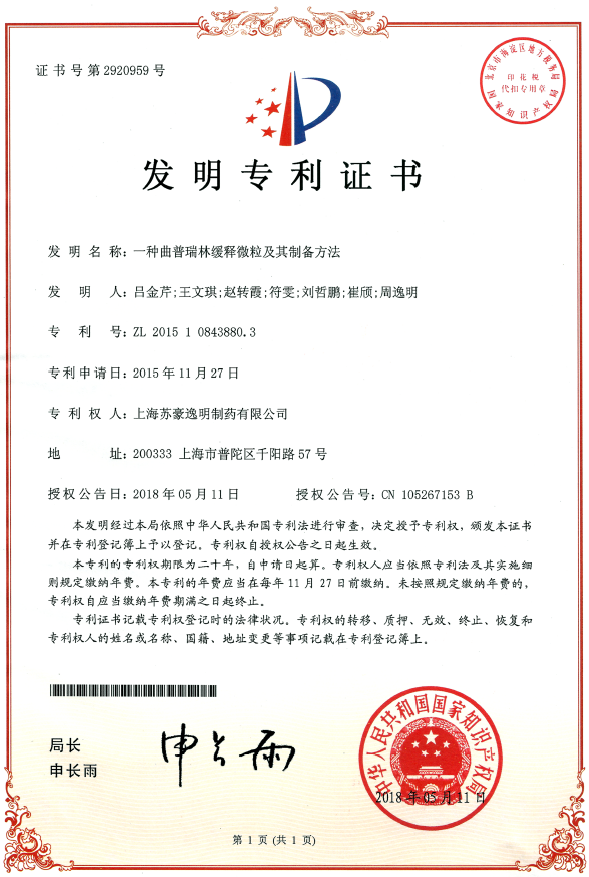 近日,我司獲得了(le)中(zhong)華人(ren)民共和國國家知識產權局授(shou)予的《發(fa)明專(zhuan)利(li)證書》。專(zhuan)利(li)名稱:一種曲(qu)普瑞林緩釋微粒(li)及(ji)其制備方法(fa)