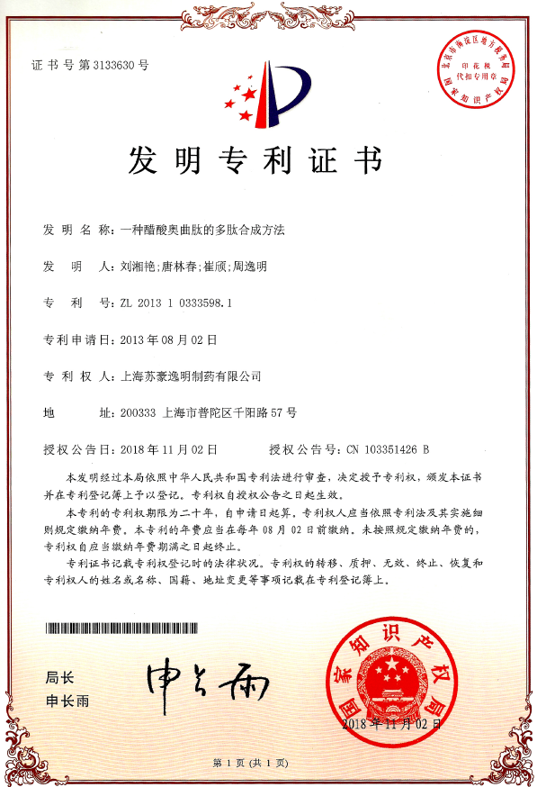 近日(ri),我(wo)司獲得(de)了中華人民共和國(guo)國(guo)家知識產權局授予的《發明(ming)專利(li)證(zheng)書》。專利(li)名(ming)稱:一種醋酸(suan)奧(ao)曲肽的多(duo)肽合成方(fang)法